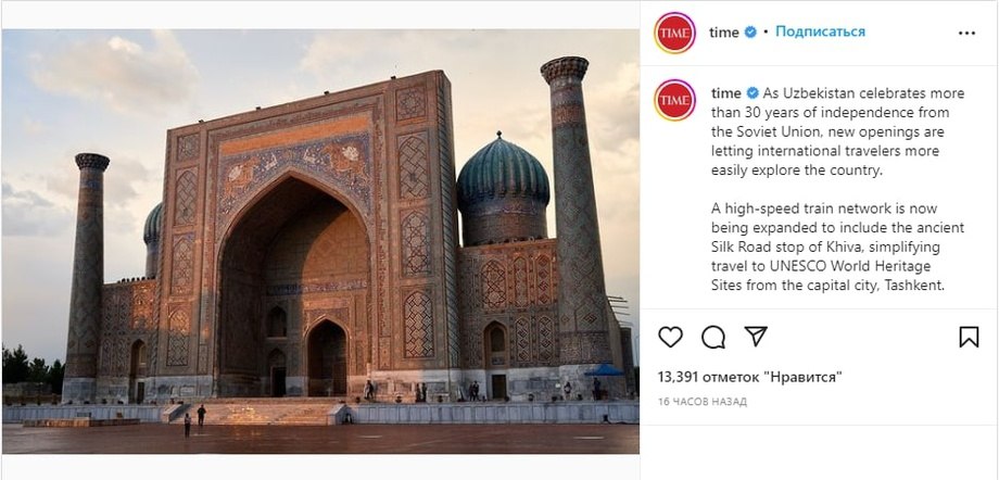 "Time" jurnali o'z Instagram sahifasida Samarqanddagi "Sherdor" madrasasini rasmini joyladi. Bu bilan dunyodagi barcha insonlarni O'zbekistonga sayohatga chorlamoqda. Bu chorlov ayni O‘zbekiston mustaqilligi bayrami arafasida tavsiya qilinayotgani alohida ta'kidlangan.
