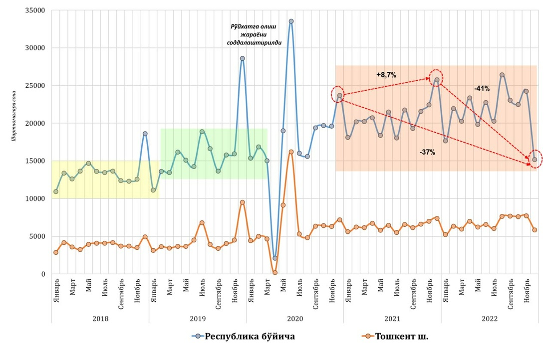 1-rasm. Ko‘chmas mulk bo‘yicha rasmiylashtirilgan oldi-sotdi shartnomalari sonining o‘zgarishi