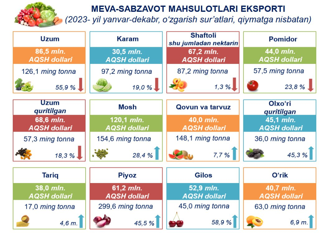 Quyida meva-sabzavot mahsulotlarining eksporti hajmi keltirilgan: