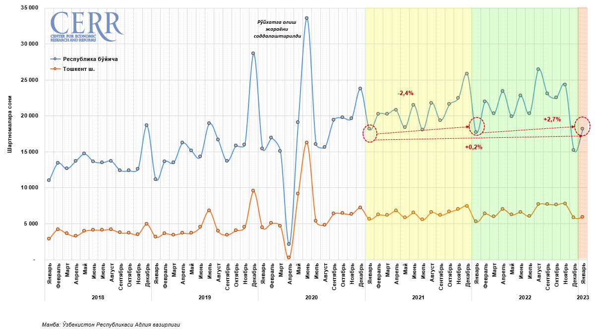 Yanvar oyida 18 mingta ko‘chmas mulk oldi-sotdi bitimlari ro‘yxatga olindi, bu 2022-yil dekabr oyiga nisbatan 19,7%ga ko‘pdir.