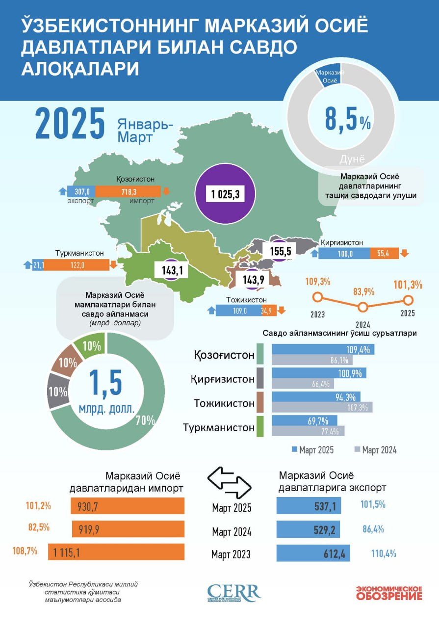 2025 yil mart oyida O‘zbekistonning Markaziy Osiyo mamlakatlari bilan tashqi savdo hajmi 1,5 mlrd dollarga yetdi, bu umumiy tashqi savdo hajmining 8,5%ini tashkil etadi.