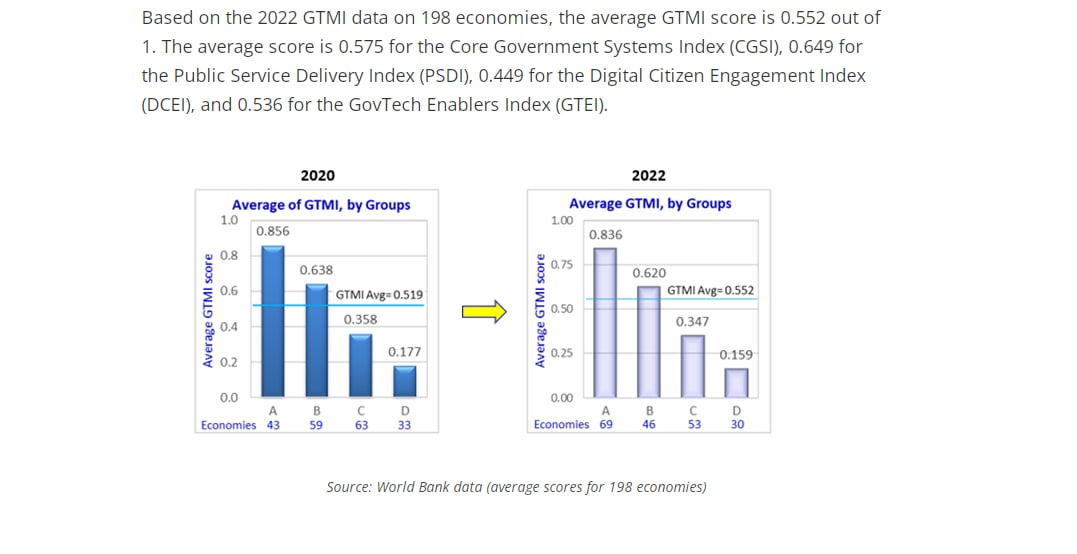 Jahon bankining "GovTech Maturity Index" natijalariga ko‘ra, hukumat va davlat xizmatlari sektori bo‘yicha O‘zbekiston 37 pog‘ona yuqorilab, 198 mamlakat ichida 43-o‘rinni egalladi va raqamli transformatsiya sohasida yetakchi mamlakatlarning “A” guruhiga kirdi.