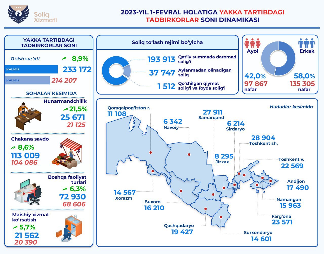 2023-yil 1-fevral holatiga ko'ra, yakka tartibdagi tadbirkorlar 233,2 mingtaga yetgan. Ulardan 42 foizi ya'ni 97 867 mingtasi ayollar, 58 foizi ya'ni 135 305 mingtasi erkaklarni tashkil etadi. Bu o‘tgan yilning mos davriga nisbatan 8,9%ga (18,9 mingta) oshganini ko'rsatadi.