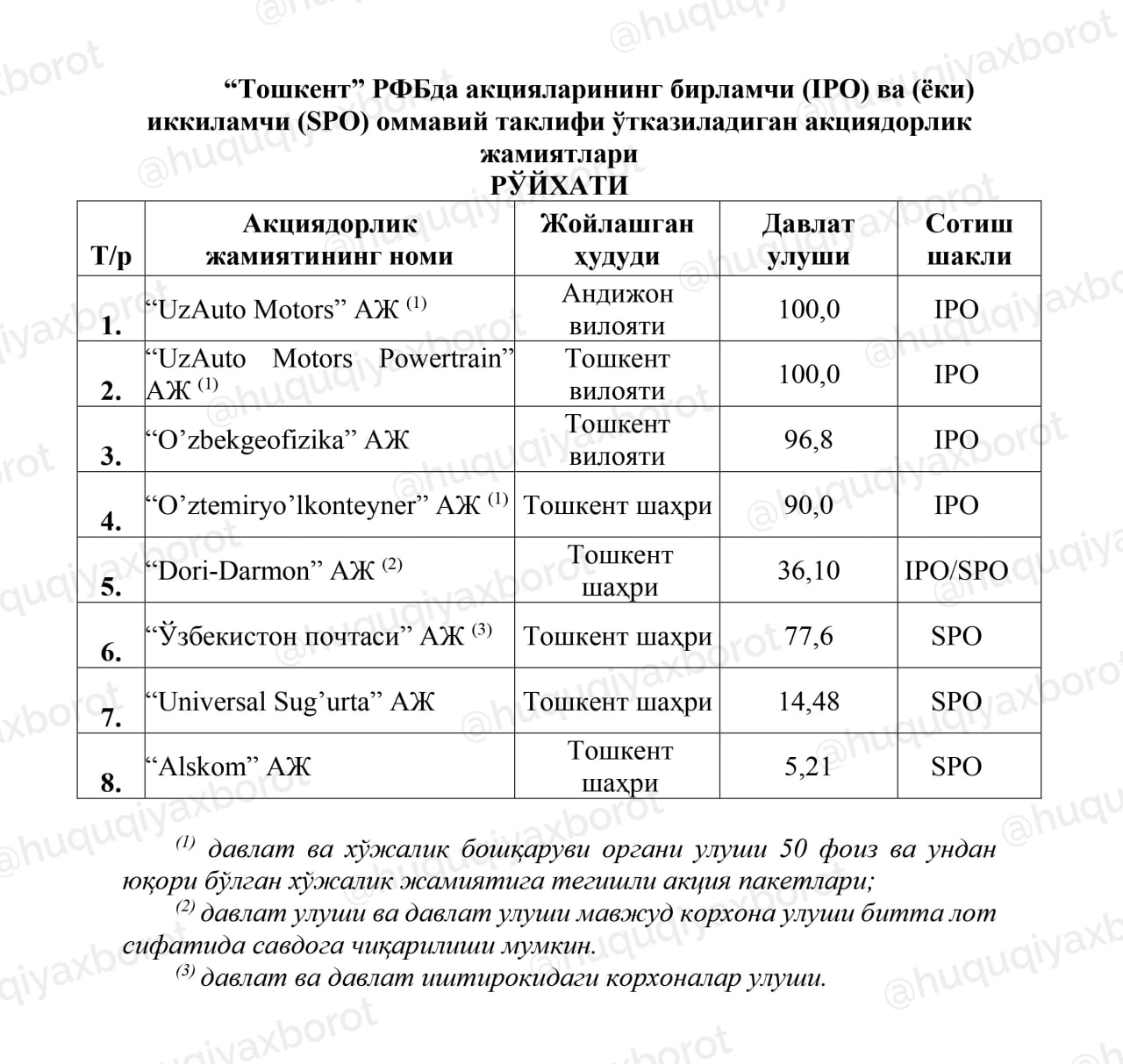 SPO orqali, ya’ni aksiyalarning ikkilamchi taklifi orqali “O‘zbekiston pochtasi” (77,6 foiz), “Universal sug‘urta” (14,48 foiz) va “Alskom” (5,21 foiz) davlat aksiyalari sotiladi.