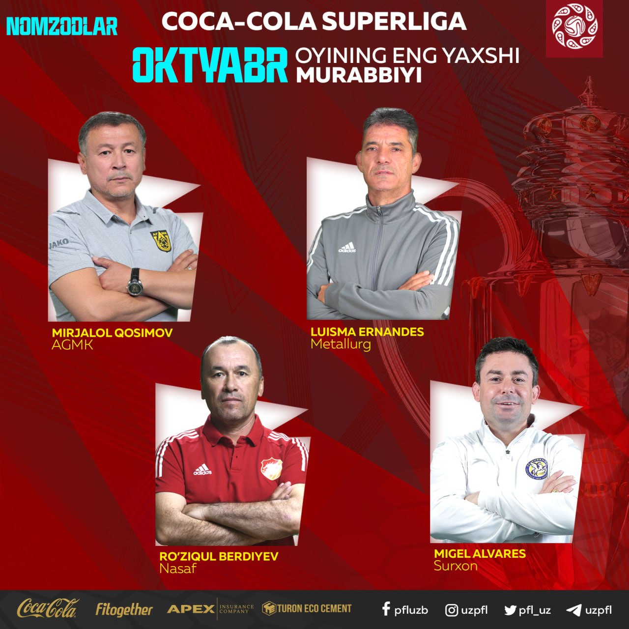 O‘zbekiston Superligasining oktabr oyidagi eng yaxshi murabbiyi nomiga da’vogarlar ro‘yxati ma’lum qilindi.