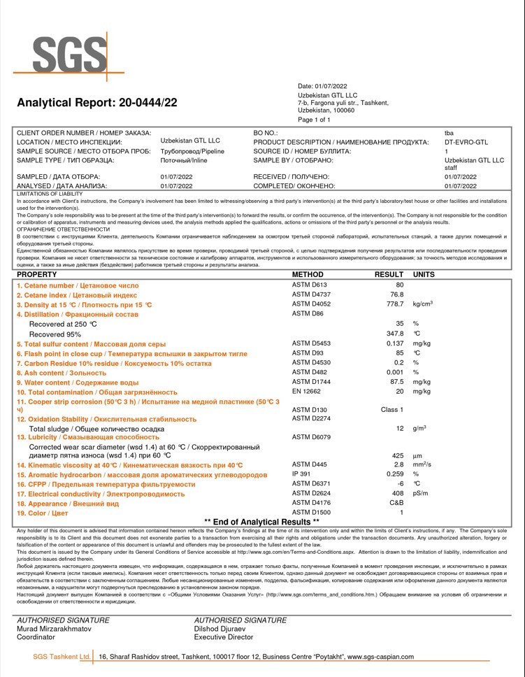 Uzbekistan GTL начал производство синтетического дизельного топлива премиум класса, полностью соответствующего высоким требованиям европейского экологического стандарта Евро-6 (EN15940) и национального стандарта O'zDSt EN15940:2022.