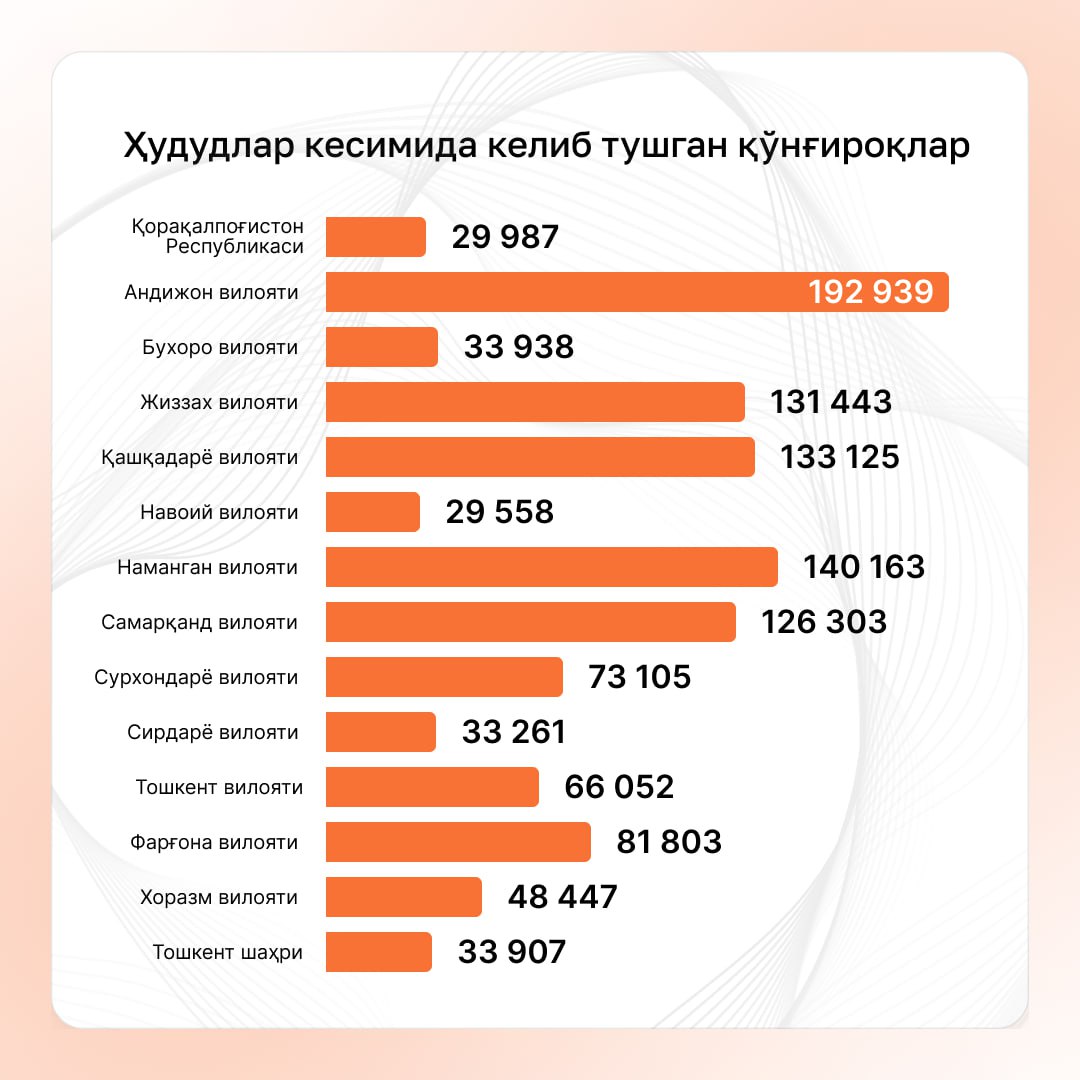 Hududlar bo‘yicha qo‘ng‘iroqlar taqsimoti: