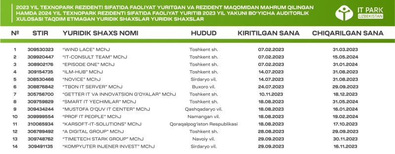 Vazirlar Mahkamasining 2019-yil 15-iyuldagi 589-son qarori bilan belgilangan majburiyatlar va talablarning bajarilishi yuzasidan o‘tkazilgan monitoring natijalariga ko‘ra, 2023-yil yakunlari bo‘yicha auditorlik xulosasini topshirmagan 110 ta rezident aniqlandi. Mazkur kompaniyalar IT Park oldidagi majburiyatlarini bajarishmadi, shu munosabat bilan ular barcha soliq imtiyozlari va preferensiyalarini bekor qilgan holda rezident maqomidan mahrum etildi.