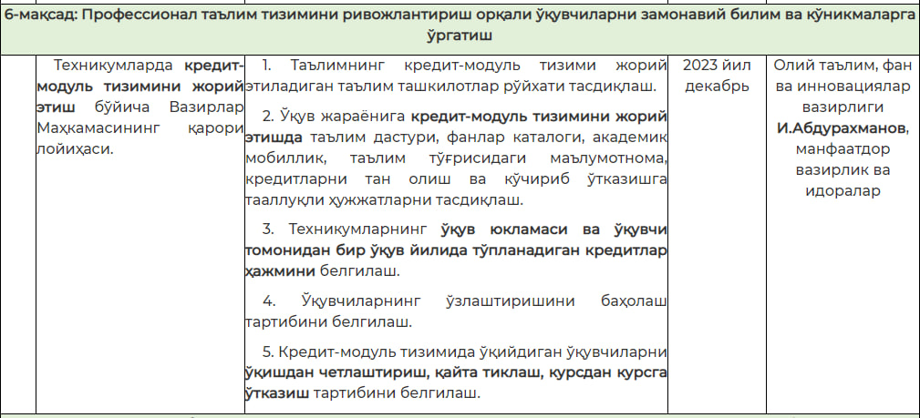 2023-yil dekabrga qadar respublikalardagi texnikumlarda kredit-modul tizimini joriy etish bo‘yicha Vazirlar Mahkamasining qarori loyihasi ishlab chiqiladi. Bu haqda "O‘zbekiston – 2030" strategiyasini tasdiqlashga doir hujjat loyihasida ma’lum qilingan.