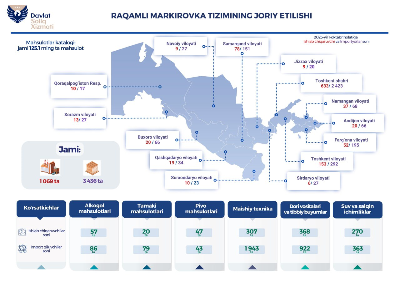 Raqamli markirovka tizimida 1 069 ta ishlab chiqaruvchi va 3 436 ta importyor ishtirok etmoqda.