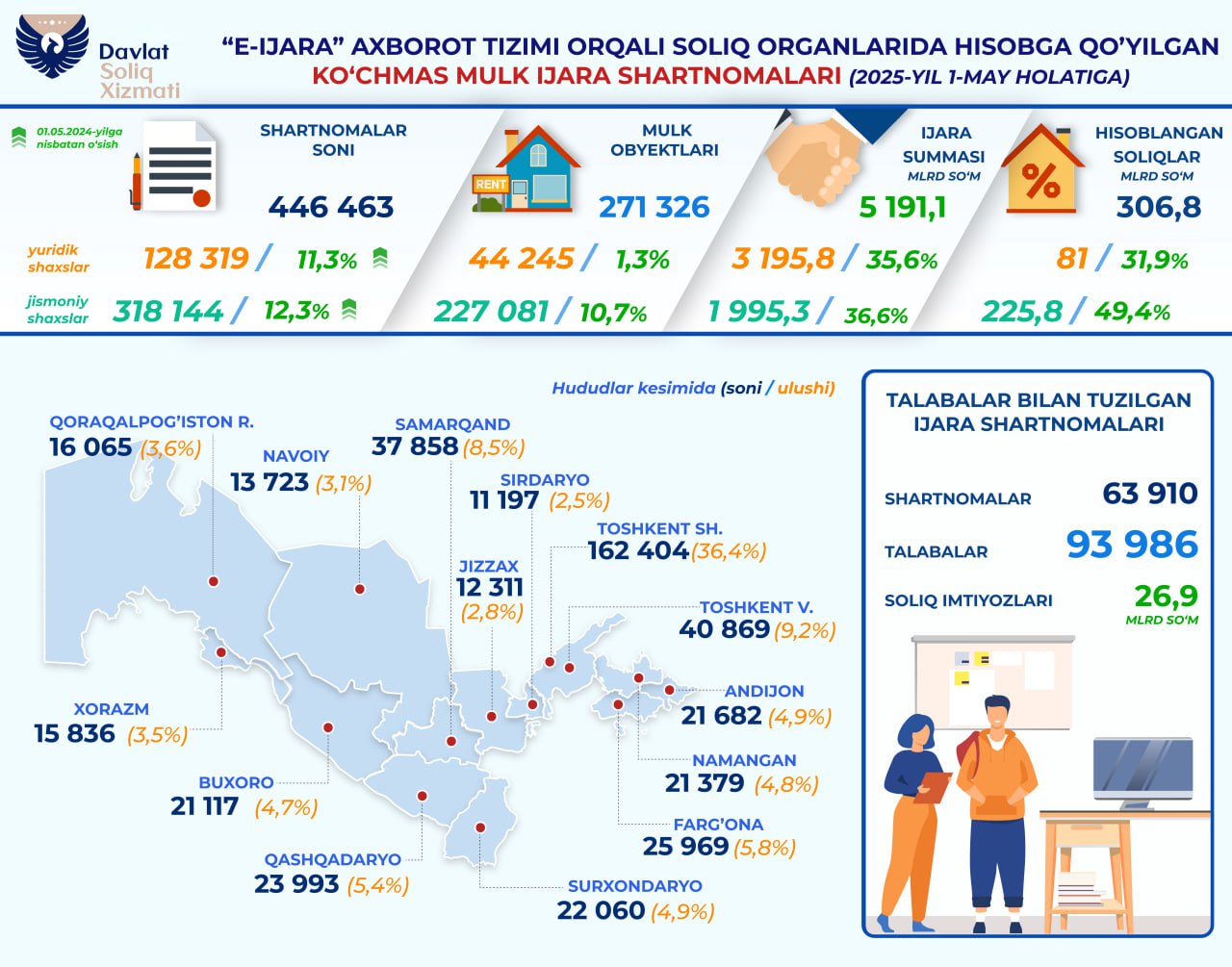 Uy-joylarni talabalarga ijaraga bergan soliq to‘lovchilar daromadlari soliqdan ozod etilgan. Yanvar-arelda daromad solig‘idan 26,9 mlrd so‘m imtiyoz qo‘llanildi. Talabalar bilan 63,9 mingdan ortiq ijara shartnomasi tuzilgan. Ijarada turuvchi talabalar soni 93 986 nafarni tashkil etdi.