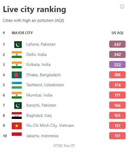 7-noyabr tongida Toshkent shahri havoning iflosligi boʻyicha IQAir reytingida Mumbay va Karachini ortda qoldirib, dunyoda 5-oʻringa chiqdi.