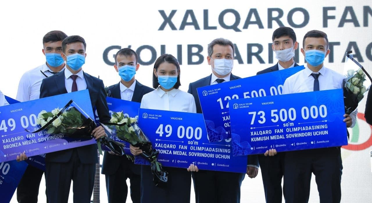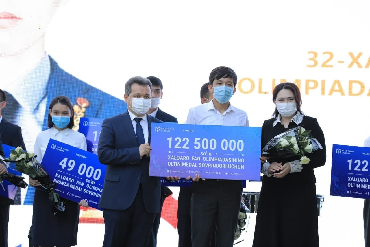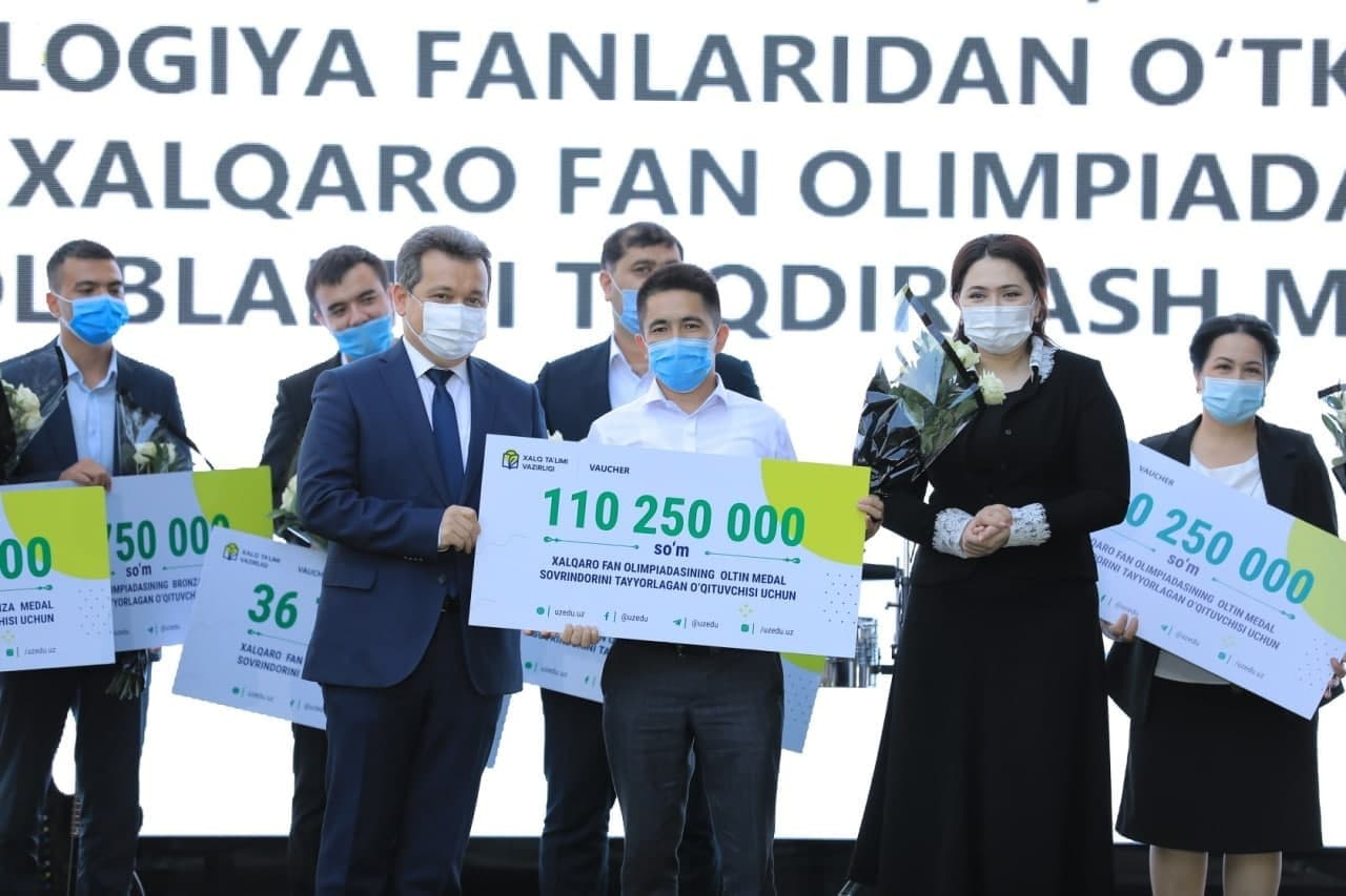 Так, ребята, удостоившиеся первого места, получили по 122,5 млн. сумов (500 БРВ). Наставники золотых медалистов получили солидную премию в размере 110 млн. 250 тыс. сумов.