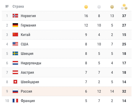 Второе место заняла команда Германии (12-10-5), третье - сборная Китая (9-4-2). По общему количеству наград первыми стали норвежцы (37), вторыми - россияне (32), третьими - немцы (27).