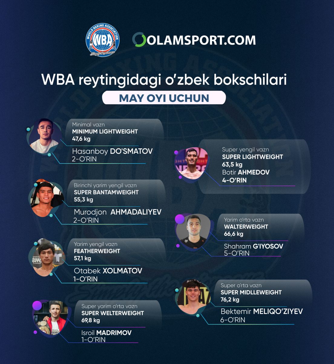 Butunjahon boks assosiatsiyasi (WBA) may oyi yakunlariga ko‘ra yangilangan reytingni e’lon qildi.