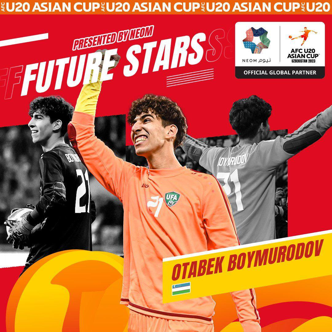 Unda O‘zbekiston yoshlar terma jamoasi posboni, U-20 Osiyo Kubogining eng yaxshi darvozaboni Otabek Boymurodov yutib chiqdi.