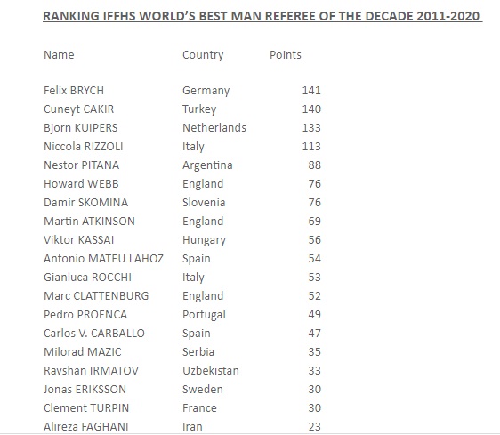 Ro'yxatda germaniyalik hakam Feliks Brix peshqadamlik qilmoqda. Ikkinchi o'rin Junayt Chaqir, 3-o'rin esa Born Kyupersga nasib qilgan.