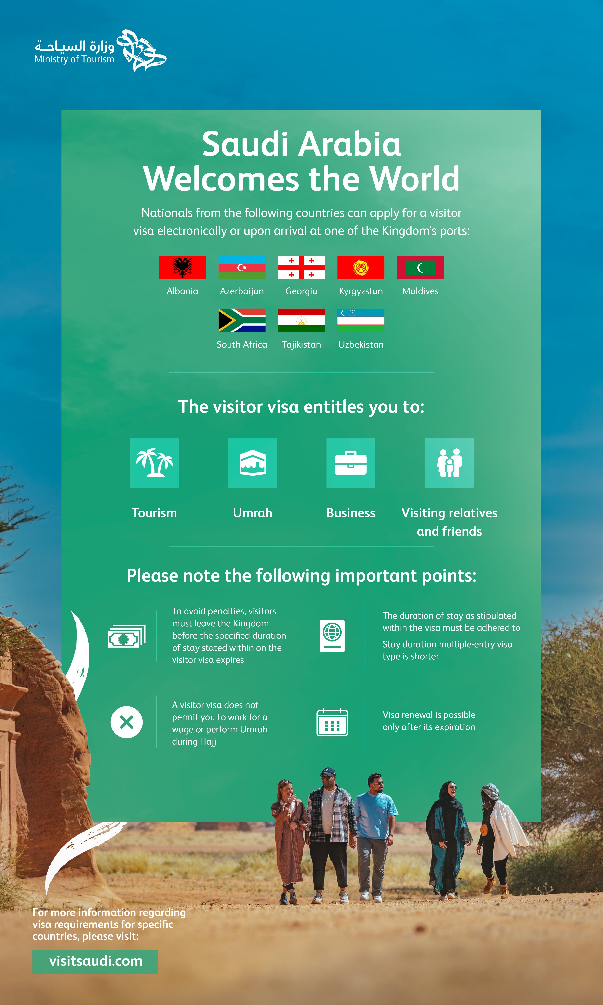 Qirollik turizm vazirligining ma’lum qilishicha, ushbu davlatlar fuqarolari, shuningdek vizani qirollik portlari yoki chegaralarida ham olishi mumkin.