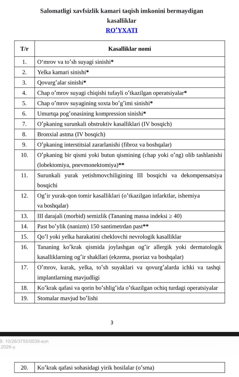 Salomatligi tufayli xavfsizlik kamarini taqish imkoni bo‘lmagan fuqarolar uchun 20 ta kasallik ro‘yxati tasdiqlandi.